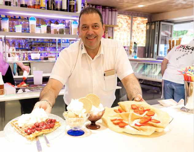 Mit viel Herzblut und Unterstützung seiner Familie entwickelte er das Eiscafé stetig weiter. Noch immer wird das Eis in Handarbeit selbst hergestellt – ein Zeichen für Qualität und Tradition.