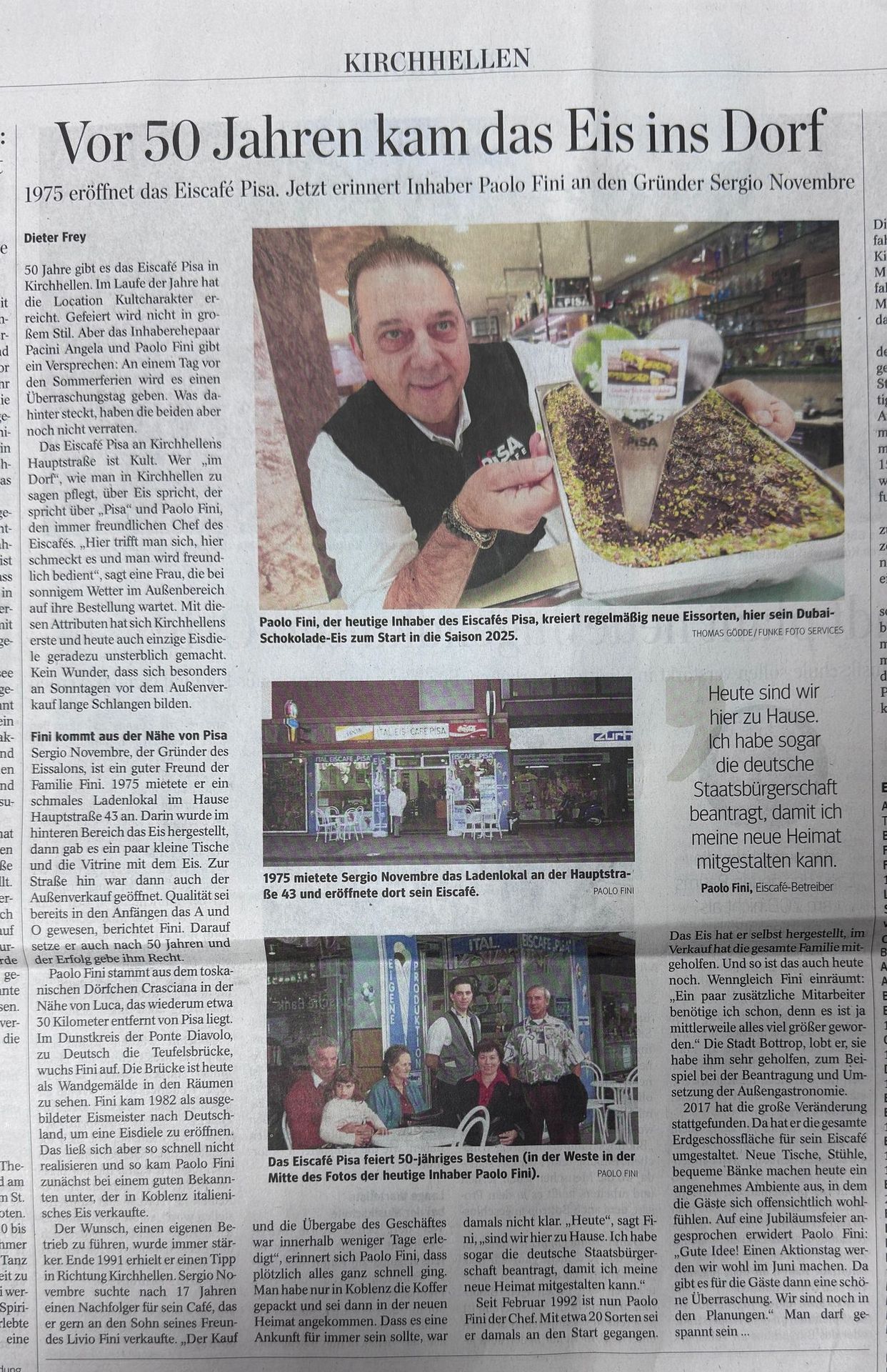 Seit 1975 bringt das Eiscafé Pisa italienische Eistradition nach Kirchhellen. Gegründet von Sergio Novembre und heute von Paolo Fini geführt, ist das Eiscafé zu einer Kultadresse geworden. An der Hauptstraße 43 begann alles mit ein paar kleinen Tischen – heute begeistert Pisa mit über 20 Eissorten und neuen Kreationen wie dem „Dubai-Schokolade-Eis“.